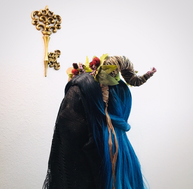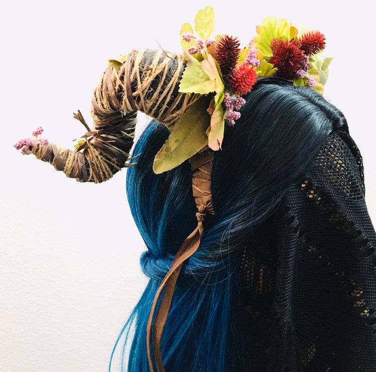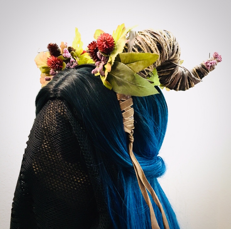 Featuring black foam horns wrapped with twine and jute, this headdress is accented with faux leaves, flowers and berries.